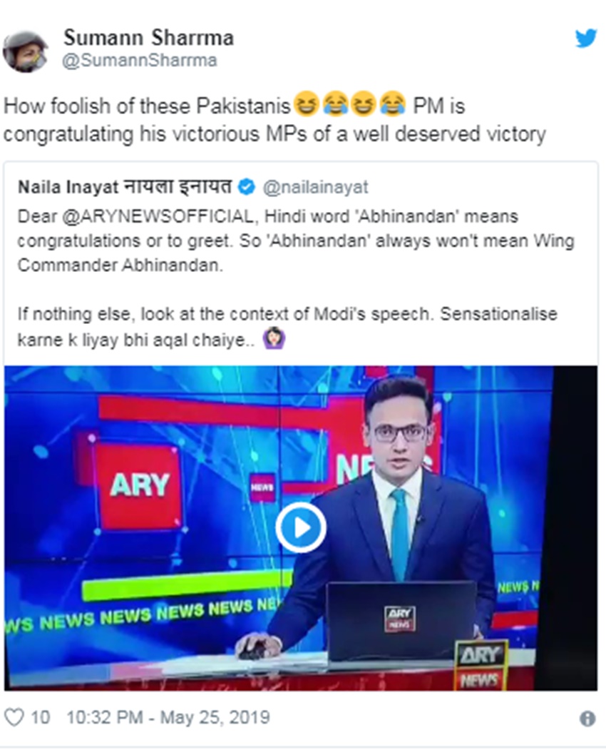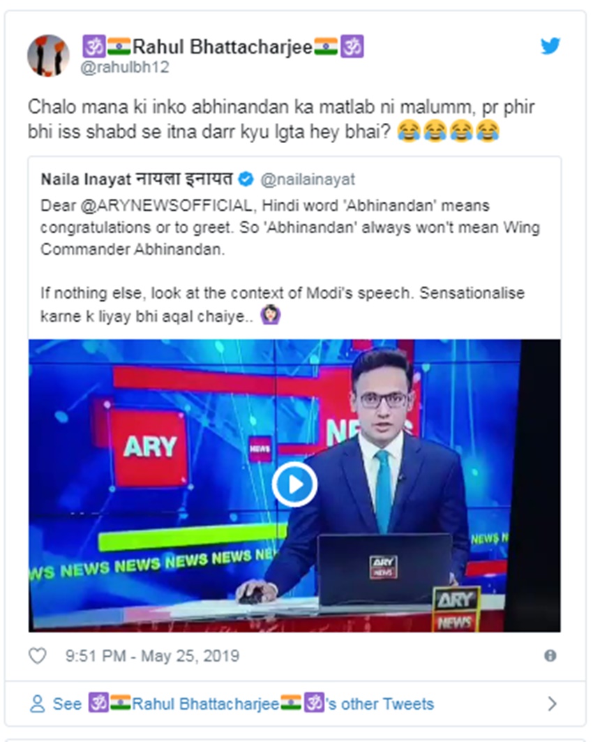 Dear @ARYNEWSOFFICIAL, Hindi word ‘Abhinandan’ means congratulations or to greet. So ‘Abhinandan’ always won’t mean Wing Commander Abhinandan.