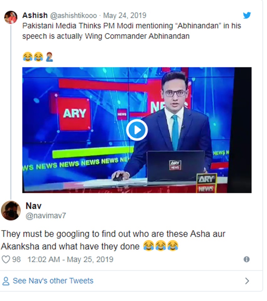इस पर ARY न्यूज के एंकर ने यह वीडिया प्रसारित करते हुए कहा कि भारत के प्रधानमंत्री नरेंद्र मोदी पाकिस्तानी सेना द्वारा पकड़े गए अभिनंदन को हीरो के तौर पर पेश कर रहे हैं। इसके बाद सोशल मीडिया पर यह वीडियो शेयर कर पाकिस्तानी एंकर को खूब ट्रोल किया जा रहा है।