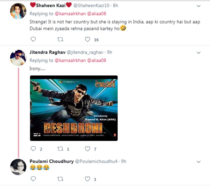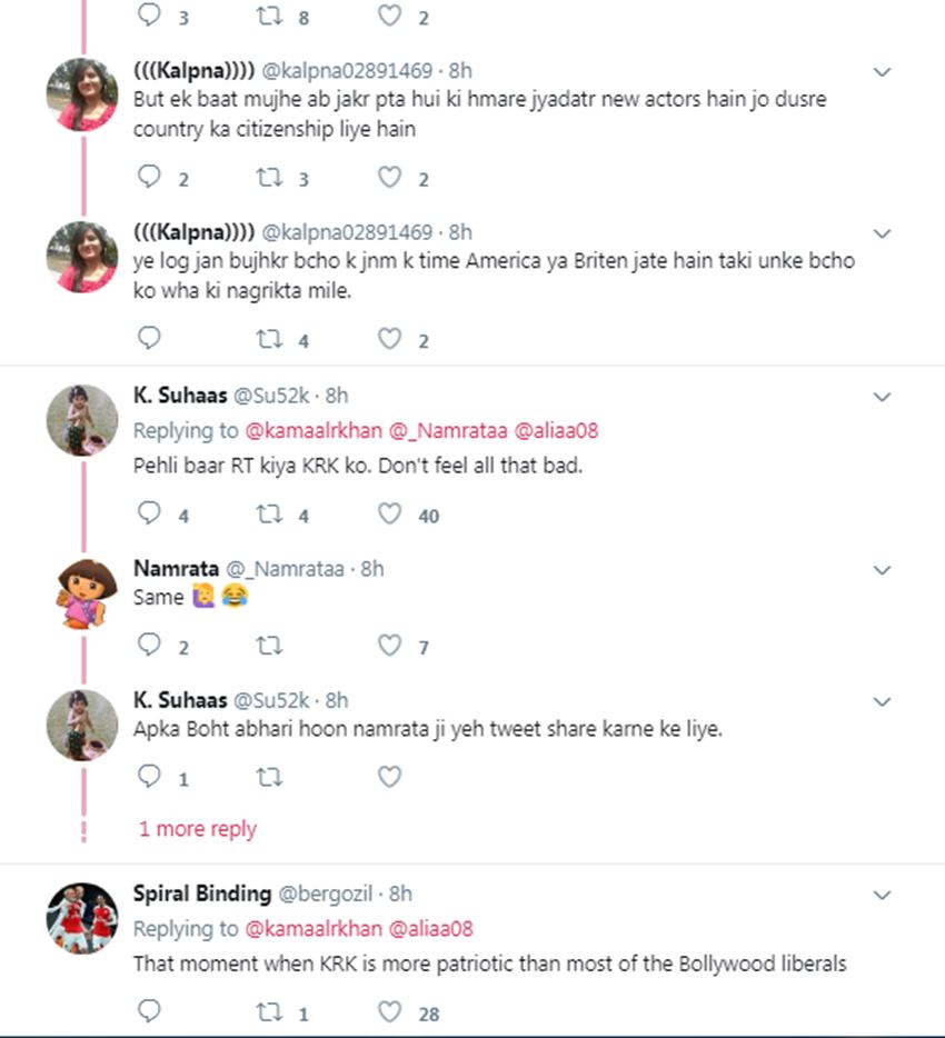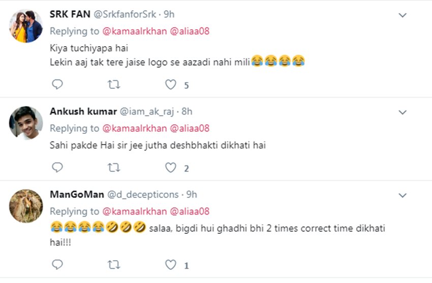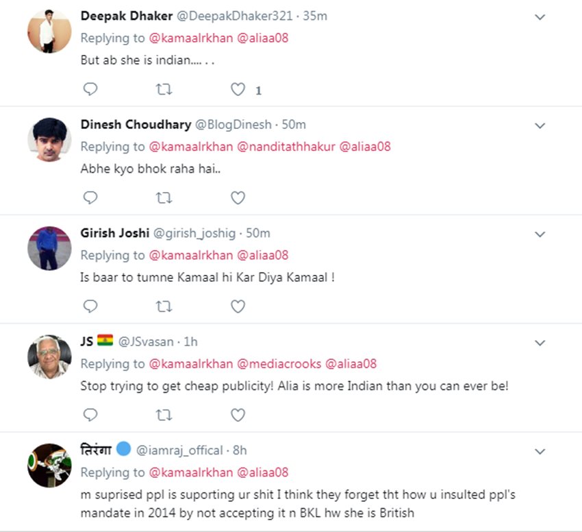 कई ट्विटर यूजर्स ने उनके समर्थन में लिखा कि पहली बार केआरके ने कोई अच्छी बात की है। वहीं कई लोगों ने उन्हें लताड़ा भी। कुछ लोगों ने कहा कि आलिया उनसे ज्यादा देशभक्त है। बहरहाल आप भी देखें केआरके का ट्वीट और उस पर लोगों की प्रतिक्रिया।