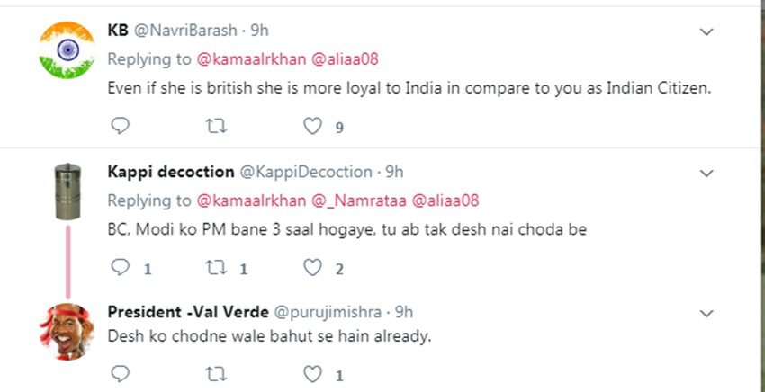 केआरके ने अपने ट्वीट में लिखा, “तुम्हारा देश? कैसे? तुम तो ब्रिटिश नागरिक हो। तुम लोगों से ही तो आजादी मिली थी आज के दिन मैडम।” दरअसल कमाल आर खान ने आलिया भट्ट की ब्रिटिश नागरिक्ता को लेकर उन पर तंज कसा। आलिया भट्ट के पास भारतीय पासपोर्ट नहीं है। उनके पास भी अपनी मां सोनी रजदान की तरह ही ब्रिटिश नागरिक्ता है। ऐसे में केआरके ने ट्विटर पर उनका मजाक बनाया। हालांकि इस बार कई ट्विटर यूजर्स कमाल खान के समर्थन में भी नजर आए। कई लोगों ने कमाल खान के इस मजाक में उन्हें ट्रोल करने के बजाए उनका साथ दिया।
