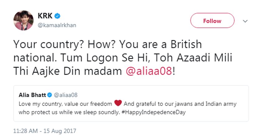 कॉन्ट्रोवर्सीज के चहीते कमाल आर खान ने एक बार फिर से ट्विटर पर किसी बवाल मचा दिया है। इस बार केआरके ने आलिया भट्ट का मजाक बनाने की कोशिश की है। मौका था स्वतंत्रता दिवस का और आलिया भट्ट ने इस मौके पर अपनी खुशी का इजहार ट्विटर के जरिए किया। आलिया ने ट्वीट कर लिखा, “अपने देश से प्यार है मुझे, अपनी स्वतंत्रता की कद्र करें। भारतीय सेना और जवानों की आभारी हूं जो हमारी हिफाजत करते हैं और जिनकी वजह से ही हम चैन की नींद सो पाते हैं। #HappyIndepedenceDay” इस पर कमाल आर खान ने आलिया की ब्रिटिश नागरिक्ता पर चुटली लेते हुए ट्वीट किया।