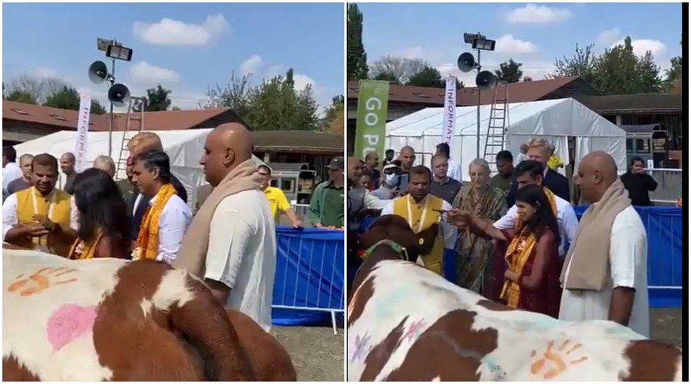 ब्रिटेन के प्रधानमंत्री पद के उम्मीदवार ऋषि सुनक में अपनी पत्नी अक्षता मूर्ति के साथ लंदन में गौ पूजा करते नजर आए। सोशल मीडिया पर वायरल हो रहे वीडियो में देखा जा सकता है कि वह अपनी पत्नी के साथ गाय की आरती भी उतार रहे हैं। इससे पहले ऋषि सुनक जन्माष्टमी मनाने को लेकर भी चर्चा में आए थे। गाय की पूजा करते ऋषि सुनक के वीडियो पर लोगों ने तरह-तरह की प्रतिक्रियाएं दी हैं।