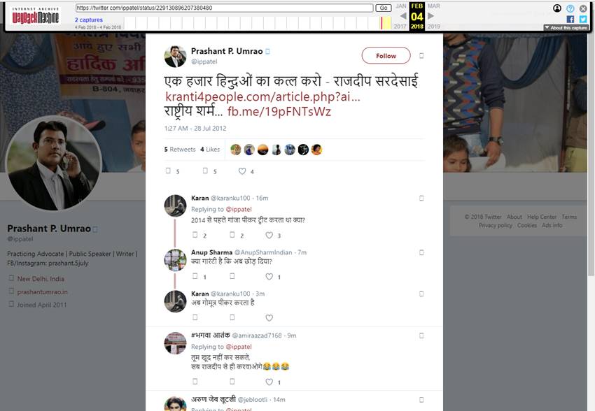सोशल मीडिया पर फेक न्यूज बहुतायत में पाई जाती है। नेताओं, अभिनेताओं के बयान को तोड़-मरोड़ कर पेश किया जाना नई बात नहीं हैं। अब नामी हस्तियों के नाम का इस्तेमाल भी कथित तौर पर नफरत फैलाने के लिए हो रहा है। ऐसे ही एक ट्वीट का स्क्रीनशॉट कपिल नाम के यूजर (खुद को ट्विटर पर AAPtard बताने वाले) ने शेयर किया है। उनके द्वारा शेयर की गई तस्वीर में वकील प्रशांत पी उमराव का एक ट्वीट है, जिसमें वरिष्ठ पत्रकार राजदीप सरदेसाई के हवाले से कहा गया है कि ‘एक हजार हिन्दुओं का कत्ल करो।’ इसके साथ स्क्रीनशॉट में एक वेबसाइट का लिंक दिया गया है। हालांकि वकील की ट्विटर टाइमलाइन पर यह ट्वीट हमें नहीं मिला, मगर वेब आर्काइव में यह ट्वीट अभी तक मौजूद है। इसी स्क्रीनशॉट का हवाला देकर आम आदमी पार्टी के सोशल मीडिया रणनीतिकार अंकित लाल ने राजदीप से इस बारे में सफाई मांगी। उन्होंने लिखा कि ”अगर यह फर्जी है तो आपको (राजदीप) प्रशांत के खिलाफ गलत बयानी के लिए एफआईआर दर्ज करानी चाहिए।” इसके जवाब में राजदीप ने लिखा, ”अंकित, क्या आपको वाकई लगता है कि एफआईआर दर्ज कराने से इन लोगों का झूठ फैलाना बंद हो जाएगा। वे जहरीले सिपाही हैं, इन्हें जहर फैलाने के पैसे मिलते हैं।”