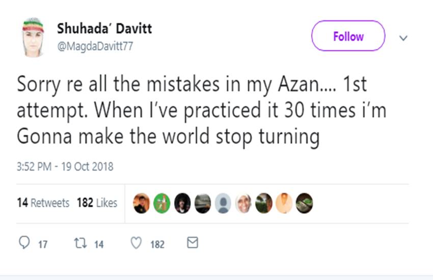 आपको बता दें कि सीनेद ओकॉनर साल 1990 में उस वक्त सुर्खियों में आई थीं जब उनहोंने ‘Nothing Compares 2 U’ गाया था। सीनेद ओकॉनर से सुहादा दावित बनने के बाद उन्होंने अपना एक वीडियो भी शेयर किया जिसमें वो अजान गाती हुईं नजर आ रही हैं। इस वीडियो को शेयर करते हुए उन्होंने लिखा कि ‘ 30 मिनट प्रैक्टिस करने के बाद पहली बार मैं अजान गा रही हूं इसलिए गलतियों के लिए माफ कर दीजियेगा।’ सुहाना दावित के इस पोस्ट के बाद कई लोगों ने सोशल मीडिया पर इसपर अपनी प्रतिक्रिया दी है।