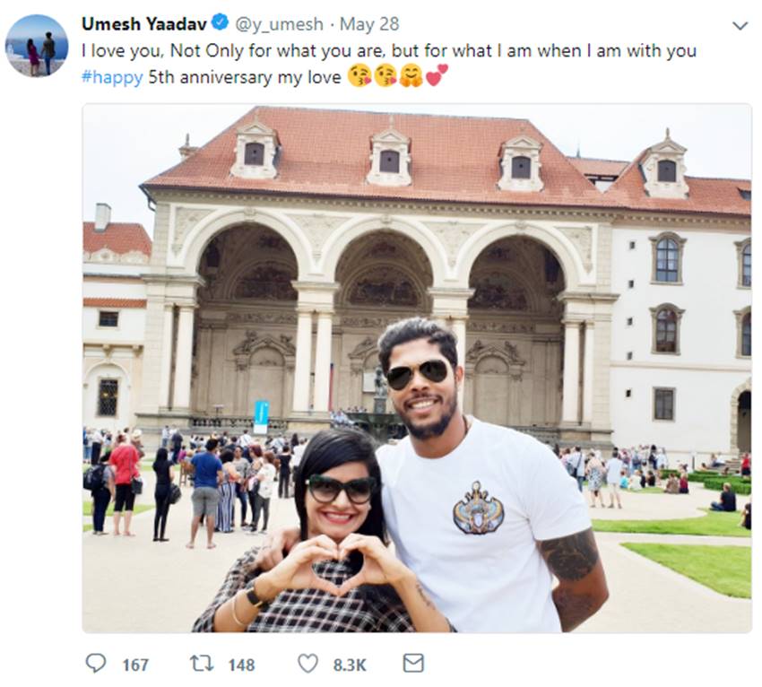 उमेश और तान्या ने इससे पहले 29 मई को शादी की पांचवीं सालगिरह मनाई थी। क्रिकेटर ने ट्वीट कर पत्नी को खास संदेश दिया था और आई लव यू बोला था। उन्होंने तब कहा था, “मैं तुमसे प्यार करता हूं। न सिर्फ इसलिए कि जो तुम हो, बल्कि मैं जो हूं और तुम्हारे साथ हूं। शादी की पांचवीं सालगिरह मुबारक हो, माई लव।”