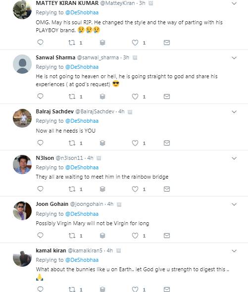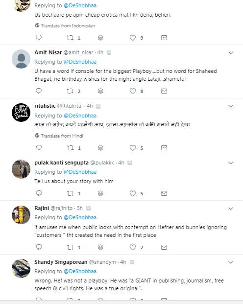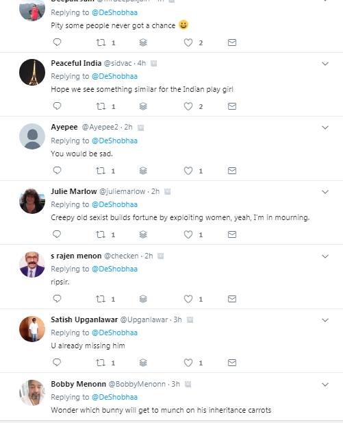 दरअसल हुआ ये कि शोभा डे ने ह्यू हेफनर के निधन के बाद ट्वीट करते हुए लिखा- दुनिया के सबसे बड़े प्लेबॉय का निधन हो गया। जन्नत की हूरें उनके स्वागत के लिए खुश होंगी।
