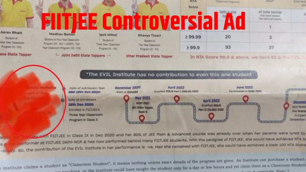 इस विज्ञापन में कोचिंग संस्थान FIITJEE ने अपने टॉपर्स स्टूडेंट्स के अलावा एक छात्रा की फोटो नाम और अन्य डिटेल के साथ छापी और उसके कैप्शन में बताया गया कि संस्थान छोड़ने और दूसरे संस्थान को ज्वाइन करने के बाद छात्रा के प्रदर्शन में गिरावट आई थी।