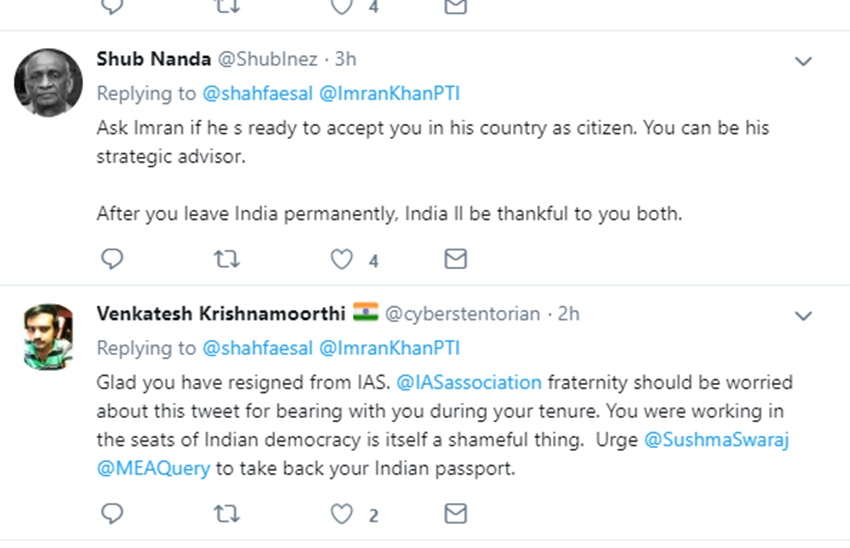 शाह फैसल राजनीति में सक्रिय हो। उन्होंने अपनी नई पार्टी बनाने की घोषणा की है। कहा तो यह भी जा रहा है कि वह बारामुला से लोकसभा का चुनाव भी लड़ सकते हैं। खैर उनकी इमरान खान को नोबल पुरस्कार देने की मांग को लेकर सोशल मीडिया ट्विटर पर लोगों ने खूब लताड़ लगाई है। बिदिशा चक्रवर्ती नामक यूजर ने लिखा तंज कसते हुए लिखा है कि मुझे लगता है ओसामा बिन लादेन ज्यादा इस इनाम के काबिल था। विपिन नाम के यूजर ने लिखा है कि वाह क्या सुझाव है, आप अगर , हाफिज सईदस मौलान मसूद को भी नामांकित कर देते तो पुरस्कार मिलने की संभावनाएं ज्यादा हो जाती।