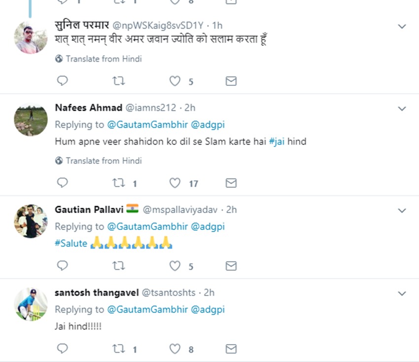 गौती ने इसी मसले पर बुधवार को भारतीय सेना को टैग करते हुए ट्वीट किया। लिखा, “किस को पहले नमन करूं। एक ने अपने खून से और एक ने अपने सिंदूर से तिरंगे में रंग भरे हैं। याद रखना कफन पर रखे यह फूल नहीं, बल्कि भारत की छाती पर रखा एक ऋण है।” ट्वीट के साथ एक फोटो भी पोस्ट किया गया था, जिसमें शहीद का पार्थिव शरीर रखा था। परिजन उसके कफन पर फूल-माला चढ़ा रहे थे और अंतिम विदाई दे रहे थे। टि्वटर यूजर्स ने उनके इसी ट्वीट पर भारतीय सेना की सराहना की और शहीदों को सलाम किया।