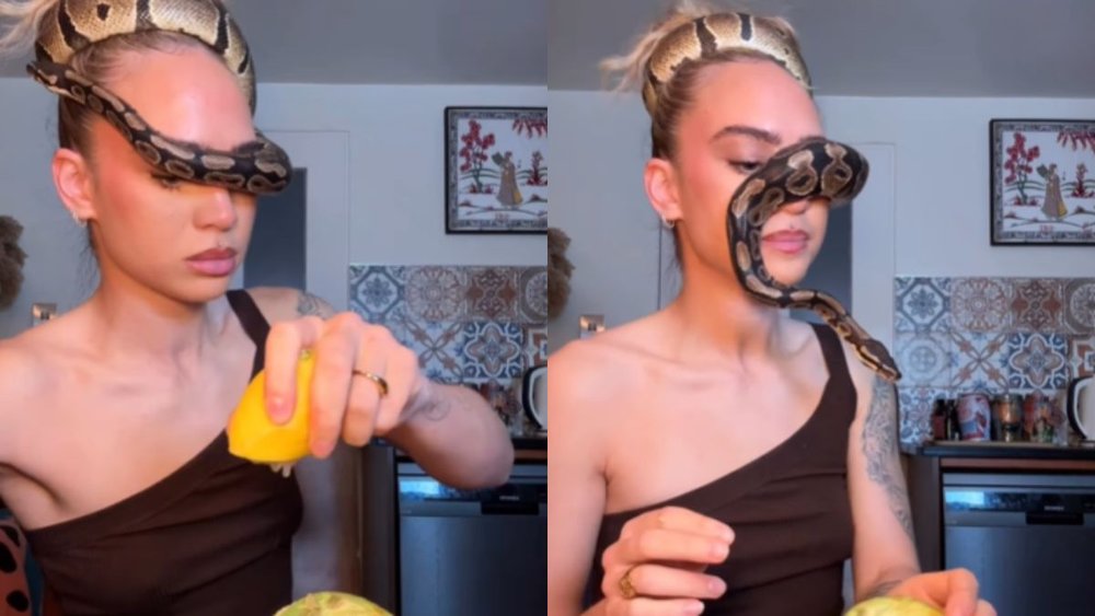 वीडियो जिसे इंस्टाग्राम पर remygumbs ने पोस्ट किया है में दिखता है कि लड़की अपने घर मेंर बैठी है और उसके सिर पर एक जीवित सांप (Live Snake) लिपटा हुआ है। सांप उसकी गर्दन और बालों के बीच से लिपटकर ऐसे बैठा है मानो वो कोई एक्सेसरी हो। युवती आराम से नाश्ता कर रही है, जैसे उसे इस स्थिति से कोई डर न हो।