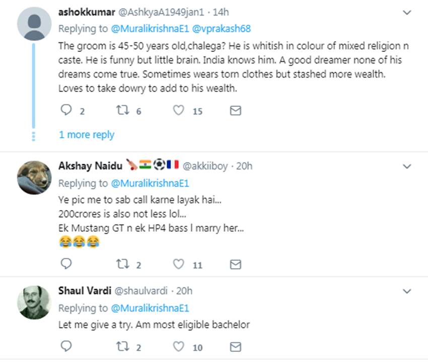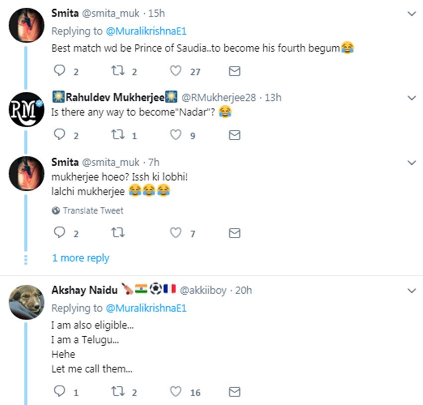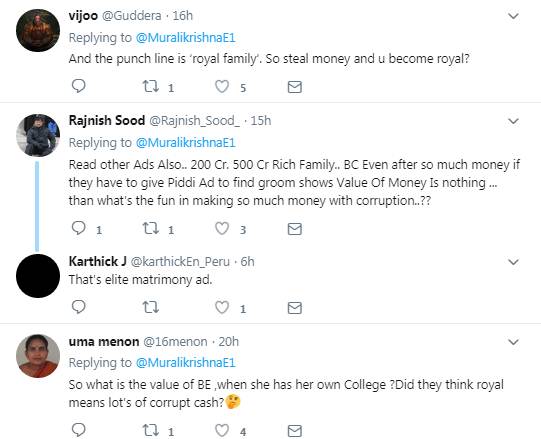 स्मिता नाम की यूजर ने लिखा, “सबसे बेहतरीन मेल सऊदी के प्रिंस के साथ बनेगा, जो कि उसकी चौथी बेगम बनेगी।” वहीं, अशोक कुमार के हैंडल से पूछा गया- 45-50 साल का दूल्हा चलेगा? वह गोरा है और थोड़ा मजाकिया भी है। देखें और लोगों ने इस विज्ञापन को लेकर कैसी-कैसी प्रतिक्रियाएं दीं-