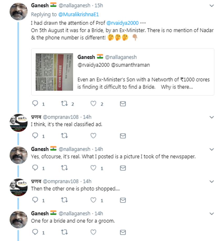 एड का स्क्रीनशॉट मुरली कृष्ण के अकाउंट (@MuralikrishnaE1) से ट्वीट किया गया। मंगलवार (21 अगस्त) को उन्होंने ट्वीट के साथ लिखा, “तमिलनाडु में हजारों करोड़ रुपए की संपत्ति वाले पूर्व केंद्रीय मंत्री की पोती के लिए दूल्हा चाहिए। टि्वटर पर लोग पता लगाएं कि आखिर कौन नेता है, जिसके पास इतनी संपत्ति है?”