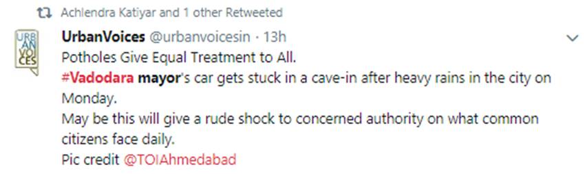 ‘अर्बन वॉइसेज’ ने ट्वीट किया कि गड्ढे सब के साथ एक जैसा सलूक करते हैं। शायद इस घटना से स्थानीय अधिकारियों और प्राधिकरण को समझ में आ गया होगा कि आखिर आम लोगों को रोजमर्रा में क्या-क्या झेलना पड़ता है। सरन पटेल ने गड्ढे में फंसी महापौर की गाड़ी को नाव बताया। उन्होंने कहा कि यह ‘स्मार्ट सिटी’ वडोदरा के महापौर की नाव है, जो विश्वामित्री नदी में तैर रही है।
