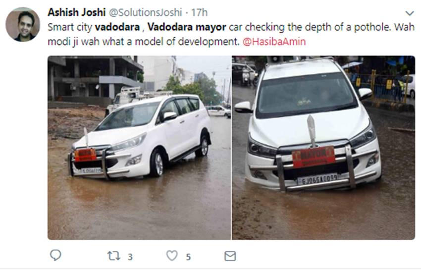 आशीष जोशी बोले कि मेयर की गाड़ी गड्ढे में फंसी नहीं थी, बल्कि वह तो उसकी गहराई को नाप रही थी। वाह मोदी जी वाह, आपने विकास का क्या मॉडल बनाया है। श्रीराज केसरिया ने लिखा, विकास पागल हो गया है। गुजरात मॉडल। प्री-मॉनसून प्लान सफल हुआ, क्योंकि वडोदरा के मेयर की गाड़ी गड्ढे में जा फंसी।