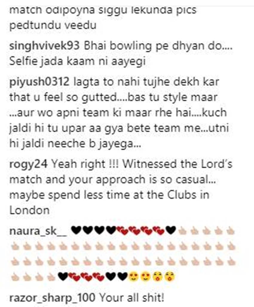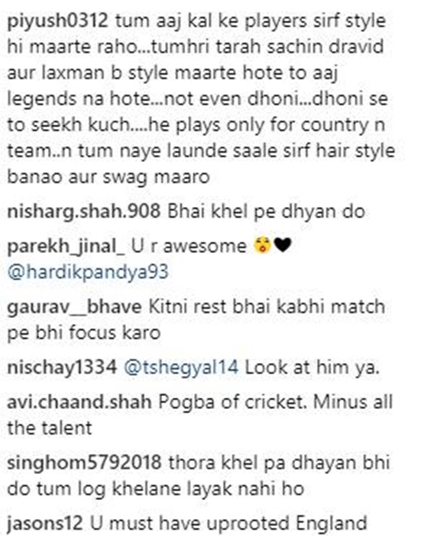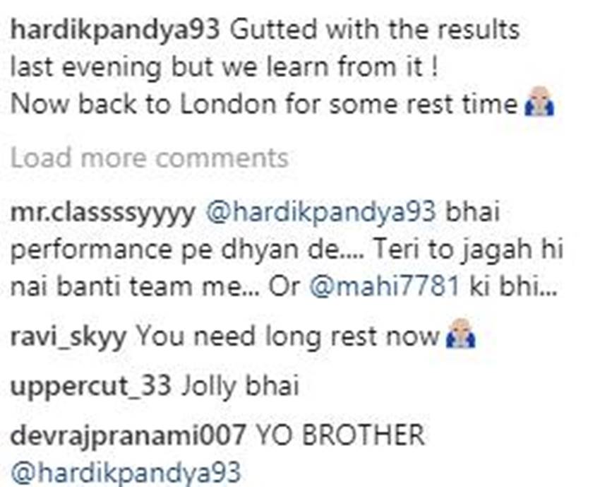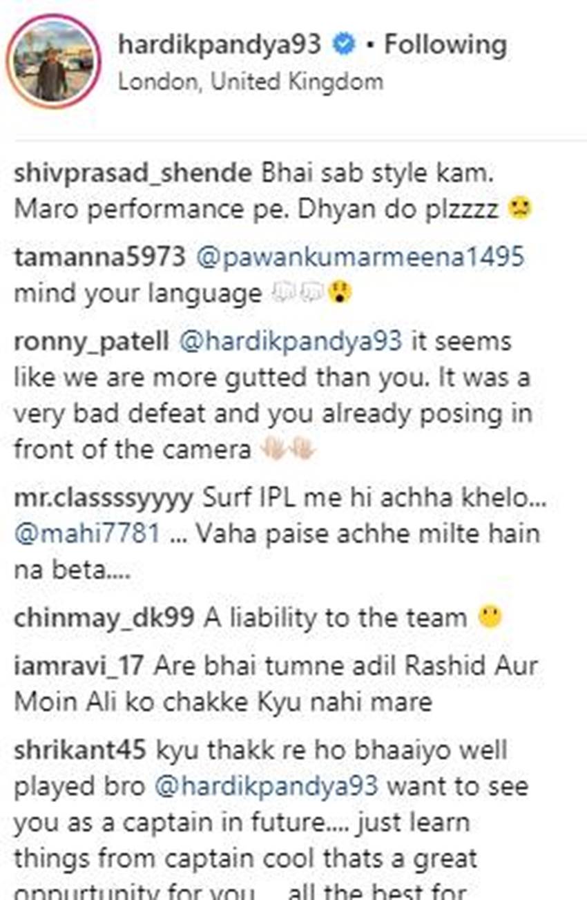 हार्दिक ने बुधवार (18 जुलाई) को इंस्टाग्राम पर लंदन के होटल रूम से एक तस्वीर अपलोड की। इस सेल्फी पर क्रिकेट फैंस उनसे मजे ले रहे हैं। एक यूजर ने लिखा, ‘भाई तू परफार्मेंस पर ध्यान दे। तेरी तो जगह ही नहीं बनती टीम में।” शिवप्रसाद ने लिखा, ”भाई स्टाइल कम मारो, परफार्मेंस पर ध्यान दो प्लीज।” रोनी ने लिखा, ”ऐसा लगता है हम आपसे ज्यादा दुखी हैं। यह एक बहुत बुरी हार थी और आप कैमरा के सामने पोज दे रहे हो।” विवेक ने कहा, ”भाई बोलिंग पर ध्यान दो, सेल्फी ज्यादा काम नहीं आएगी।”