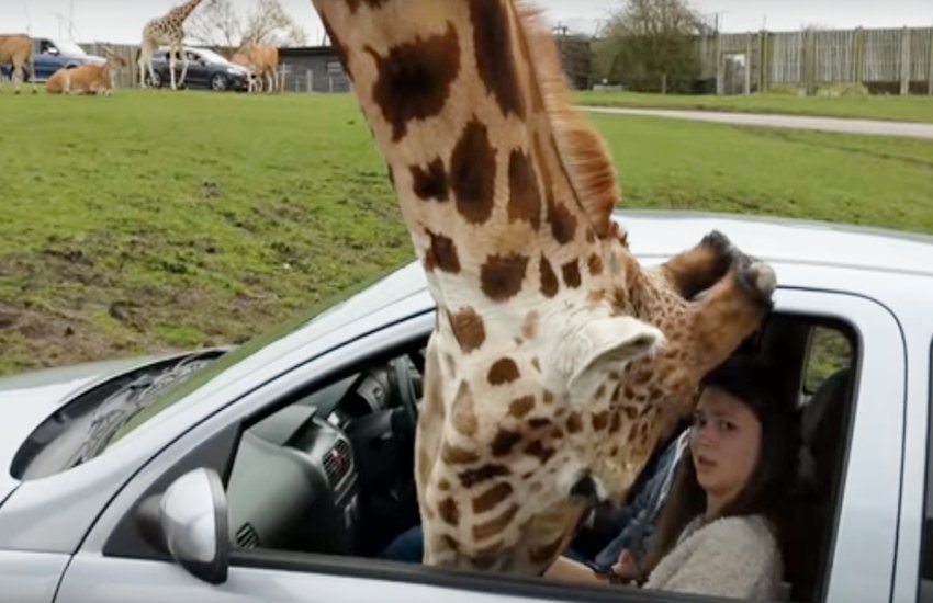 इंग्लैंड के एक सफारी पार्क में बेहद ही चौंकाने वाली घटना हुई। यहां वूस्टरशायर के स्थित वेस्ट मिडलेंड सफारी पार्क में एक जिराफ ने पर्यटकों की कार के अंदर सिर डाल दिया, जिससे पर्यटक काफी चिंतित हो गए और हड़बड़ी में वह कार की खिड़की का शीशा बंद करने लग गए, जिससे जिराफ का सिर खिड़की में फंस गया। उसने जैसे ही अपना सिर निकालने की कोशिश की, खिड़की का कांच टूट गया। गनीमत यह रही कि इससे जिराफ को किसी तरह की चोट नहीं लगी। यह सारी घटना साथ में मौजूद दूसरे पर्यटक ने मोबाइल में रिकॉर्ड कर ली।