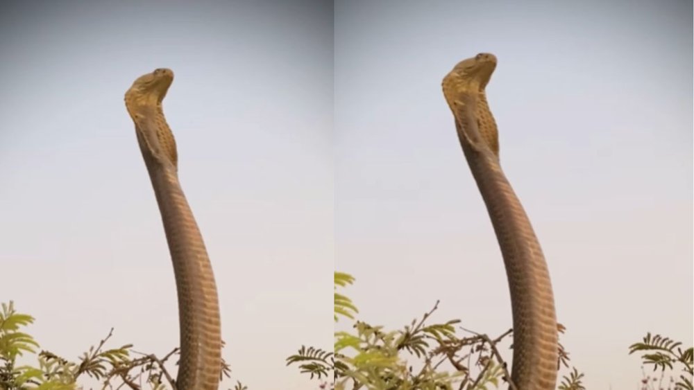 इनदिनों किंग कोबरा का एक वीडियो इंटरनेट पर आग की तरह फैल रहा है। वीडियो में विशालकाय किंग कोबरा पेड़ पर फन फैलाए बैठा दिख रहा है।