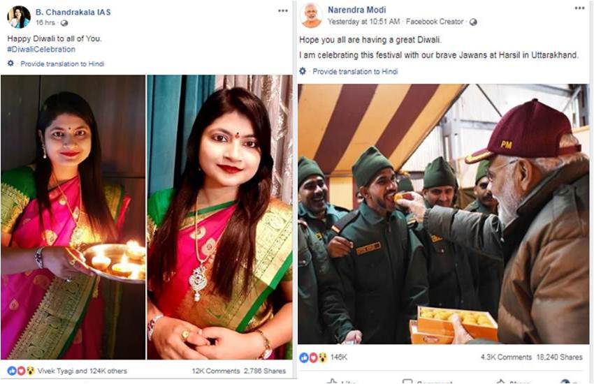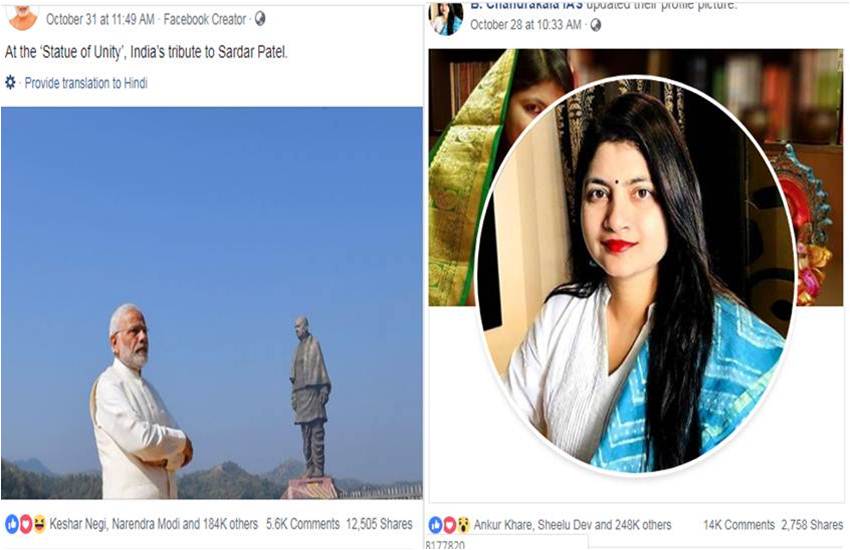 पीएम नरेंद्र मोदी के फेसबुक पेज की बात करें तो उनके 4 करोड़ से अधिक फॉलोवर्स हैं। वहीं आईएएस चंद्रकला के फेसबुक पर लगभग 86 लाख फॉलोवर्स ही हैं। मतलब पीएम से लगभग 5 गुना कम। 5 गुना कम फॉलोवर्स के साथ भी चंद्रकला पीएम को सोशल मीडिया में कड़ी टक्कर दी थी। ऐसा सिर्फ दिवाली की फोटो की तुलना में ही नहीं कहा जा सकता। इससे पहले भी जब 31 अक्टूबर को प्रधानमंत्री मोदी ने स्टैच्यू ऑफ यूनिटी के साथ अपनी एक तस्वीर फेसबुक पर पोस्ट की थी तो ये फोटो खूब वायरल हुई। इस फोटो को अब तक 1 लाख 84 हजार के करीब लाइक्स मिले थे। वहीं इसके दो दिन पहले ही बी चंद्रकला ने फेसबुक पर अपनी प्रोफाइल पिक्चर अपलोड की थी। उस तस्वीर को लगभग 2.5 लाख लाइक्स मिल चुके थे।