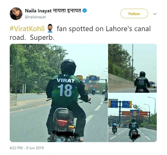 कोहली के इस प्रशंसक की तस्वीरें मशहूर पत्रकार नायला इनायत ने अपने ट्विटर अकाउंट पर शेयर की है। इसके साथ ही उन्होंने लिखा, ‘लाहौर के कनाल रोड पर नजर आया विराट कोहली का फैन। शानदार।’ नायला इनायत ने कोहली के प्रशंसक की तीन तस्वीरें शेयर की है, जिनमें वह कोहली का नाम लिखी हरे रंग की टी-शर्ट पहन लाहौर की सड़कों पर बाइक दौड़ा रहा है। तस्वीरें वायरल होने पर सोशल मीडिया यूजर्स भी जमकर प्रतिक्रिया दे रहे हैं। कई यूजर्स ने कोहली के प्रशंसक की सुरक्षा को लेकर चिंता जाहिर की।