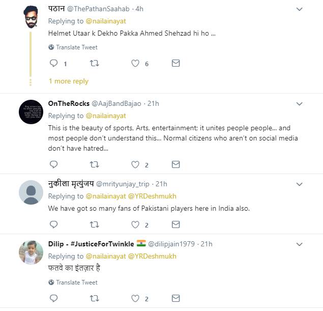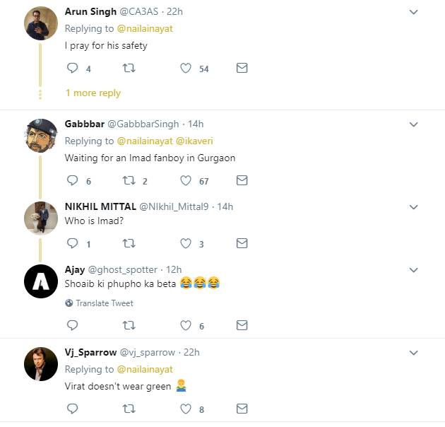 गब्बर नाम के यूजर ने लिखा कि गुड़गांव में इमाद के एक प्रशंसक की तलाश है। एक यूजर ने लिखा कि विराट हरी टी-शर्ट नहीं पहनते। पठान नाम के यूजर ने कमेंट कर लिखा, ‘हेलमेट उतार कर देखो पक्का अहमद शहजाद ही होगा।’ ऑन द रॉक ट्वीट कर लिखते हैं, ‘यह खेल, आर्ट और मनोरंजन की खूबसूरती है जो लोगों को आपस में जोड़ता है। बहुत से लोग इसे नहीं समझेंगे। आम नागरिक जो सोशल मीडिया पर नहीं हैं, नफरत नहीं करते।’