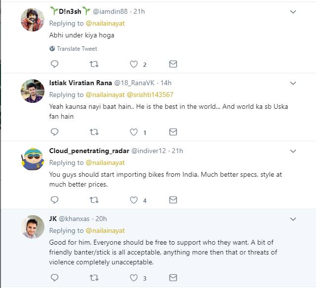 नुकीला मुत्युंजय लिखते हैं, ‘हमें भी भारत में पाकिस्तानी खिलाड़ियों के बहुस से प्रशंसक मिले हैं।’ दिलीप लिखते हैं, ‘फतवे का इंतजार है।’ राणा ट्वीट कर लिखते हैं, ‘इसमें क्या नई बात है। विराट दुनिया में बेस्ट हैं और दुनिया में सब उसके प्रशंसक हैं।’ एक ट्वीट में लिखा गया, ‘पाकिस्तान की तरफ से अच्छा इशारा।’ अरुण सिंह ने लिखा, ‘मैं उसकी सुरक्षा की कामना करता हूं।’