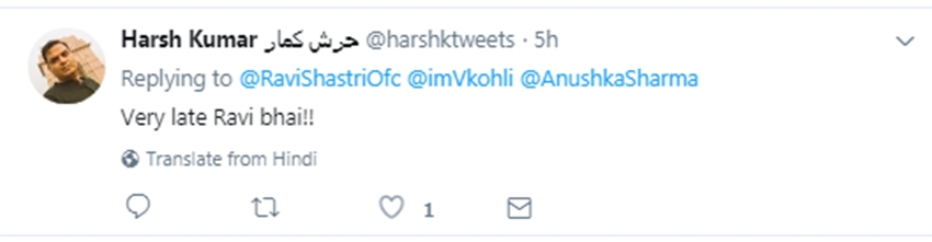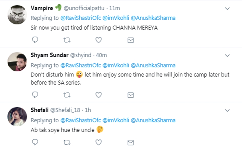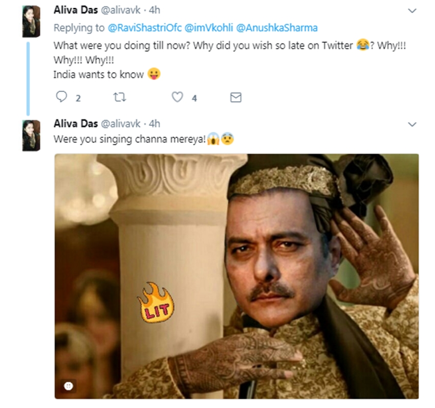 शास्त्री ने शनिवार को फेसबुक और ट्विटर पर दोनों को शादी की शुभकामनाएं दी। लिखा, “ढेर सारी शुभकामनाएं नौजवान। ईश्वर आप दोनों पर कृपा बरसाए। आप दोनों की शादीशुदा जिंदगी खुशियों से भरी रहे।” उन्होंने इसी के साथ विराट और अनुष्का को पोस्ट में टैग भी किया। चूंकि शास्त्री ने बधाई थोड़ी देर से, इस पर टि्वटर यूजर्स ने उन्हें घेरा और मजे लिए। एक यूजर ने शास्त्री से पूछा, “अंकल अब तक सोए हुए थे क्या?” एक अन्य ट्विटर हैंडल से सवाल आया, “अभी तक क्या कर रहे थे? इतना देरी से क्यों बधाई दी? क्यों?” वहीं, एक ने कहा, “कोच साहब की घड़ी एक हफ्ते पीछे चलती है क्या?” देखिए कुछ और ऐसे ही ट्वीट्स-