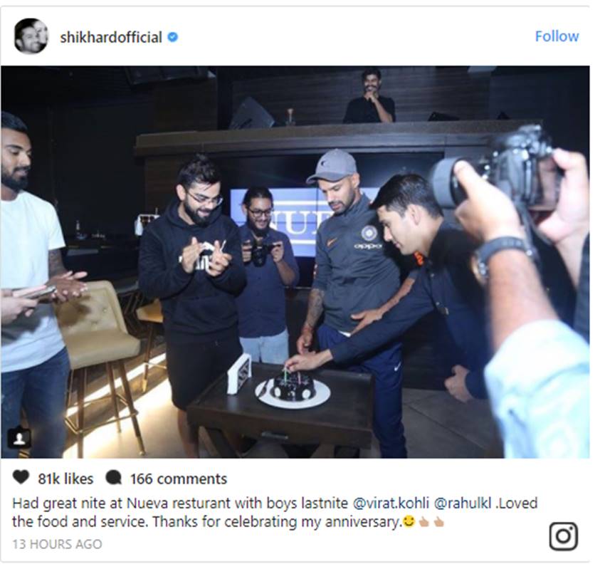 पार्टी में धवन ने केक भी काटा था। इस दौरान धोनी, कोहली और के.एल राहुल उनके साथ थे। धवन ने पार्टी की तस्वीरें अपने सोशल मीडिया अकाउंट पर पोस्ट कीं। इंस्टाग्राम पर फोटो के साथ उन्होंने लिखा, “न्यूएवा रेस्तरां में लड़कों (विराट कोहली और के.एल राहुल को टैग करते हुए) के साथ बीती रात शानदार रही। खाना और सर्विस पसंद आई। मेरी शादी की सालगिरह मनाने के लिए शुक्रिया।”