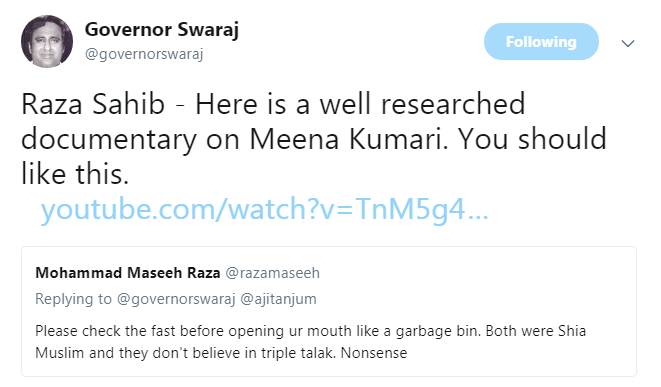 एक बार में बोलकर तीन तलाक (इंस्टेंट) पर फैसला आने से पहले सुषमा स्वराज के पति स्वराज कौशल ने एक ट्वीट किया था। इसपर एक शख्स ने उनके बारे में अपशब्द कहे। दरअसल गवर्नर स्वराज मीना कुमारी और कमाल अमरोही से जुड़े एक किस्से का जिक्र करना चाहते थे। जिसके लिए उन्होंने लिखा कि मीना कुमारी ने अमरोही से कहा था, ‘तलाक तो दे रहो नजर ए कहर के साथ, जवानी भी मेरी लौटा दो मेहर के साथ।। इसपर मोहम्मद महेश रजा नाम से शख्स ने स्वराज के लिए लिखा, ‘कृपया कचरे के डब्बे की तरह अपना मुंह खोलने से पहले जरा फैक्ट चेक किया करो। दोनों शिया मुसलमान थे और ट्रिपल तलाक में यकीन नहीं रखते थे।’