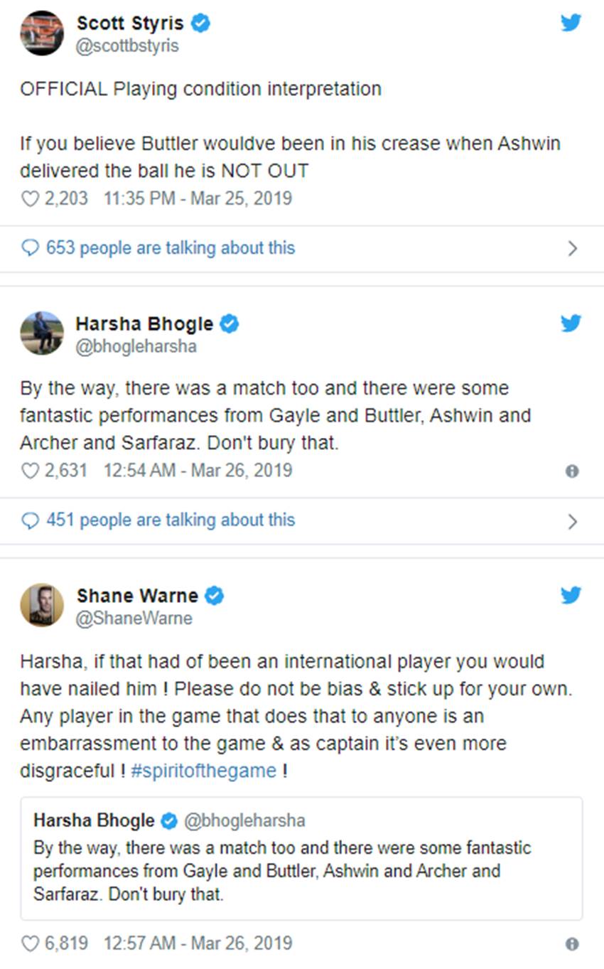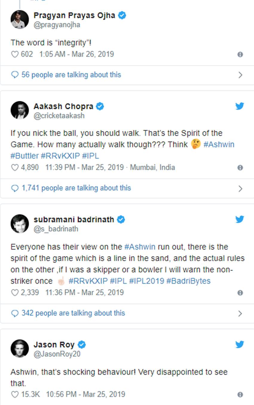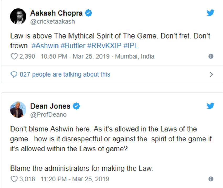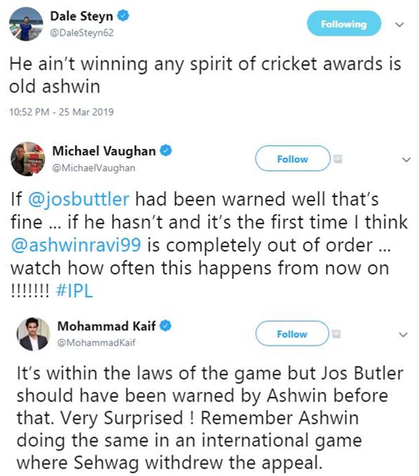 दक्षिण अफ्रीका के महान तेज गेंदबाज डेल स्टेन ने लिखा, “अश्विन को इसके लिए क्रिकेट की भावना का अवार्ड मिलने नहीं जा रहा।” पूर्व भारतीय क्रिकेटर मोहम्मद कैफ ने कहा, “यह खेल के नियमों के भीतर हुआ मगर जॉस बटलर को अश्विन की तरफ से चेतावनी दी जानी चाहिए थी। मैं बेहद हैरान हूं। याद रहे कि अश्विन एक अंतरराष्ट्रीय मैच में भी ऐसा कर चुके हैं जहां (वीरेंद्र) सहवाग ने अपील वापस ले ली थी।”