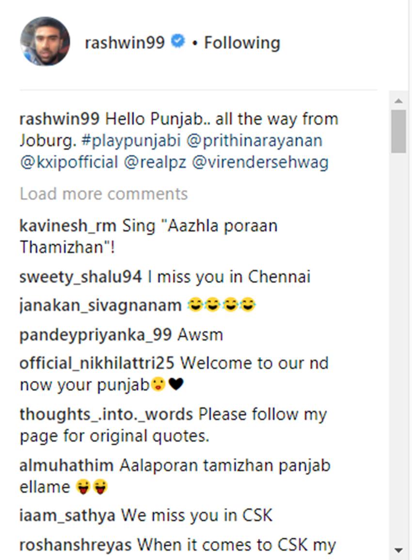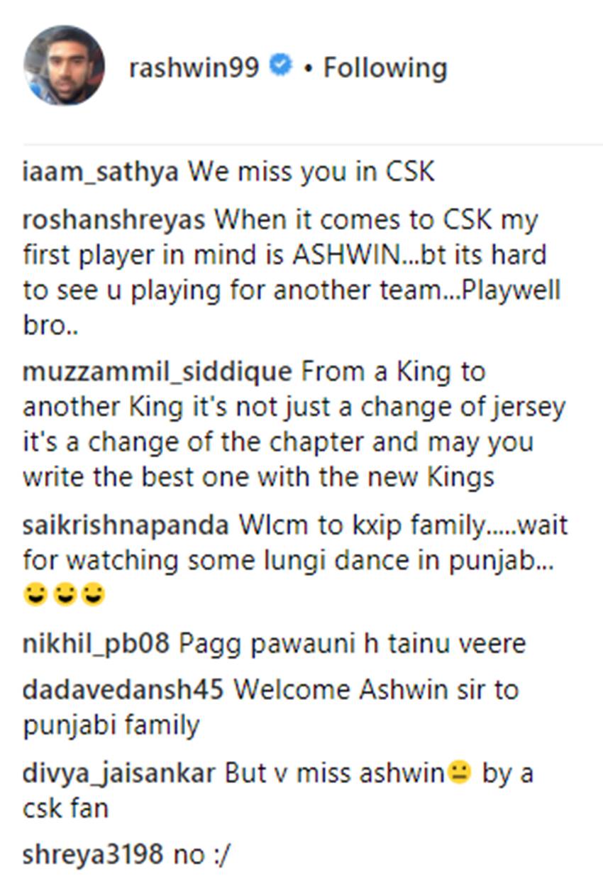 भारतीय क्रिकेट टीम के दिग्गज स्पिनर रविचंद्रन अश्विन अब इंडियन प्रीमियर लीग (IPL )में किंग्स इलेवन पंजाब (KXIP) की ओर से खेलेंगे। आईपीएल के खिलाड़ियों की नीलामी के पहले दिन अश्विन को लेकर पंजाब और राजस्थान रॉयल्स (RR) के बीच होड़ हुई थी। आखिरकार पंजाब ने 7.6 करोड़ रुपये की बोली लगाकर अश्विन को अपने साथ जोड़ा। अश्विन इससे पहले चेन्नई सुपर किंग्स (CSK) के लिए खेलते थे, मगर इस साल उन्हें रिटेन नहीं किया गया। फिलहाल अश्विन दक्षिण अफ्रीका में हैं, जहां भारतीय क्रिकेट टीम दो महीने लंबे दौरे पर गई हुई है। जोहान्सबर्ग से इंस्टाग्राम पर पत्नी प्रीति के साथ सेल्फी अपलोड कर अश्विन ने KXIP को ‘हैलो’ कहा है। इस पोस्ट में अश्विन ने फ्रेंचाइजी की सह-मालकिन प्रीति जिंटा व टीम के सलाहकार वीरेंद्र सहवाग को भी टैग किया है। अश्विन की इस पोस्ट पर CSK फैंस ने खूब कमेंट किया। अश्विन दक्षिण भारत से आते हैं और चेन्नई में खेलते हुए उनके प्रशंसकों की सूची बेहद लंबी हो गई है। यहां भी फैंस ने उन्हें भविष्य के लिए शुभकामनाएं देते हुए कहा कि वह उन्हें टीम में मिस करेंगे।