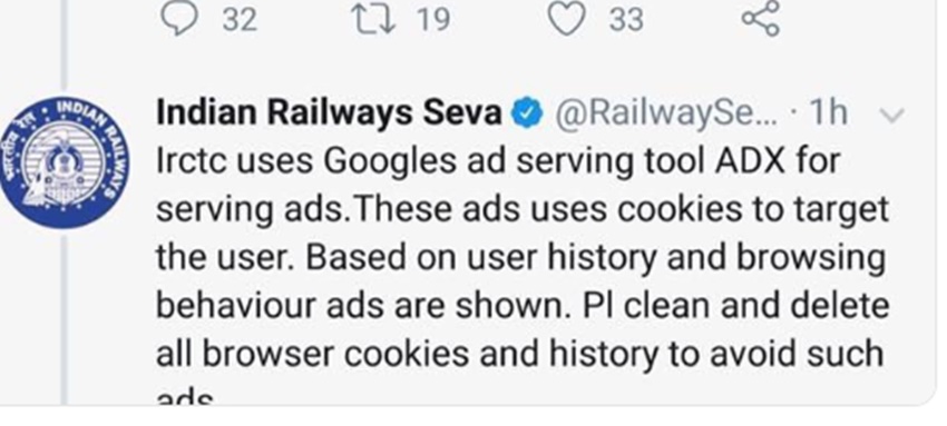 वहीं यूजर को आईआरसीटीसी के अधिकारियों ने जवाब देते हुए लिखा- ‘आईआरसीटीसी विज्ञापनों की सेवा के लिए गूगल विज्ञापन सर्विंग टूल एडीएक्स का उपयोग करता है। ये विज्ञापन उपयोगकर्ता को आकर्षित करने के लिए कुकीज का उपयोग करते हैं। उपयोगकर्ता के इतिहास और ब्राउजिंग व्यवहार के आधार पर विज्ञापन दिखाए जाते हैं। ऐसे विज्ञापनों से बचने के लिए सभी ब्राउजर कुकीज और हिस्ट्री को साफ करें और हटाएं।’