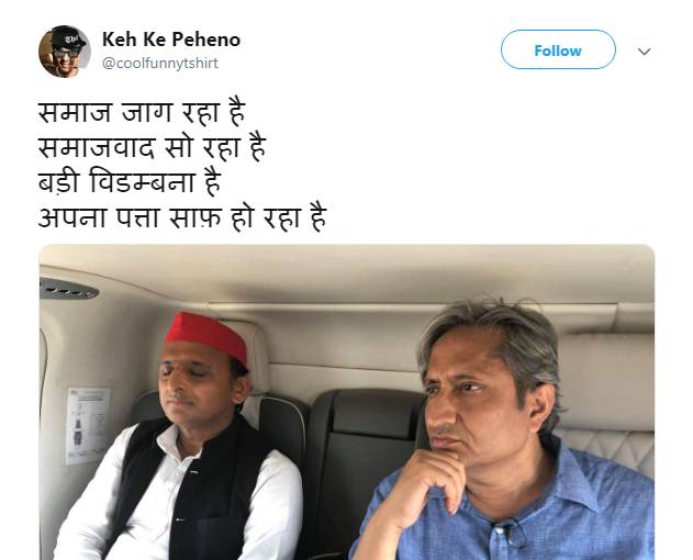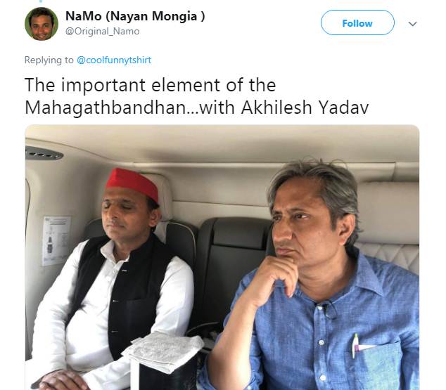 दरअसल रवीश कुमार अपने प्राइम टाइम शो में सत्ताधारी पार्टी के खिलाफ मुखर रहे हैं। यही वजह है कि गठबंधन की रैली में रवीश कुमार के मंच पर दिखने को लेकर कई यूजर्स कमेंट कर रहे हैं। हालांकि सोशल मीडिया पर ट्रोल होने के बाद रवीश कुमार ने भी इस पर अपनी सफाई देते हुए पलटवार किया है। फेसबुक पर लिखी एक पोस्ट में रवीश कुमार ने लिखा है कि “कुछ लोगों को काम नहीं है। आज यूपी में अखिलेश यादव के साथ कैंपेन ट्रेल कवर कर रहा था। उनके हेलीकॉप्टर में और रैलियों में। मंच पर भी गया। देखने की कि नेता के भाषण का रेस्पांस है। अब उसे ऐसे घेर कर बता रहे हैं कि मुझे बैठने की कुर्सी नहीं दी गई। थोड़ा लेवल बढ़ाओ भाई। वैसे कुर्सी दे गई थी, लेकिन मैं बैठने नहीं फोटो खींचने गया था।” इस पोस्ट के साथ रवीश कुमार ने एक तस्वीर भी पोस्ट की है, जिसमें गठबंधन की रैली के मंच पर दिखने को लेकर उन पर तंज कसा गया है। रवीश कुमार अखिलेश यादव के साथ भी दिखाई दिए।