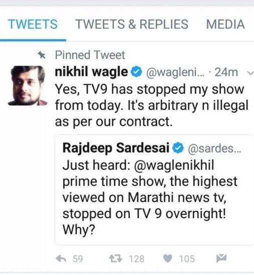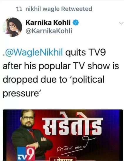 पिछले सप्ताह वरिष्ठ पत्रकार राजदीप सरदेसाई ने ट्वीट कर कहा, ‘मराठी में सबसे ज्यादा देखे जाने वाले जर्नलिस्ट निखिल वागले का शो रातों रात मराठी न्यूज चैनल टीवी नाइन ने बंद कर दिया। इससे पहले भी एक और पत्रकार के साथ ऐसा ही हुआ था।’ जिसे स्वीकारते हुए निखिल वागले ने लिखा, ‘ हां टीवी नाइन ने आज से मेरा शोर बंद कर दिया है। क्योंकि ये शो मनमाना और गैर कानूनी था।’ घटना के कुछ दिन बाद लिखिल वागले ने एक और ट्वीट में लिखा, ’38 साल की पत्रकारिता में मैंने सभी राजनीतिक पार्टियों की आलोचना की। शारीरिक हमले का सामना भी किया। लेकिन पिछले चार सालों में फैले इस जहर का अनुभव कभी नहीं किया।’ जानकारी के लिए बता दें कि निखिल वागले जब अपनी मराठी शो को होस्ट कर रहे थे तब उन्होंने इसे लेकर कई ट्वीट किए भी जिसे यूजर्स ने जमकर शेयर किया। हालांकि अब निखिल वागले का आरोप है कि महज राजनीतिक दबाव की वजह से चैनल ने उनके शो को बंद करने का फैसला लिया है। जानकारी के लिए बता दें कि इससे पहले कथित तौर पर बिजनेसमैन गौतम अडानी के खिलाफ लिखने वाले पत्रकार परंजॉय गुहा ठाकुरता को सप्ताहिक मैगजीन इकॉनोमिक एंड पॉलिटिकल वीकली (ईपीडब्ल्यू) से हटाया दिया गया था।