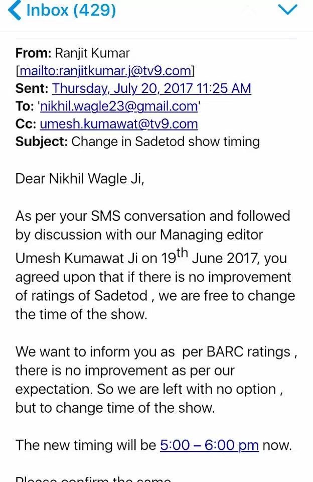 Just heard: @waglenikhil prime time show, the highest viewed on Marathi news tv, stopped on TV 9 overnight! Why?