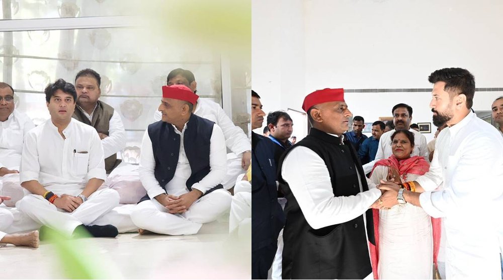 उत्तर प्रदेश के पूर्व मुख्यमंत्री मुलायम सिंह यादव के निधन (Mulayam Singh Yadav Death) के बाद से ही सैफई में कई राजनेता समाजवादी पार्टी के मुखिया अखिलेश यादव (Akhilesh Yadav) और उनके परिवार से मिलने पहुंच रहे हैं। इसी क्रम में केंद्रीय मंत्री ज्योतिरादित्य सिंधिया (Jyotiraditya Scindia) ने अखिलेश से मुलाकात कर मुलायम सिंह को श्रद्धा सुमन अर्पित किया। इसके साथ रालोजपा के अध्यक्ष चिराग पासवान (Chirag Paswan) भी मुलायम को श्रद्धांजलि देने में सैफई पहुंचे थे। जिसकी तस्वीर अखिलेश ने अपने सोशल मीडिया हैंडल से शेयर की।