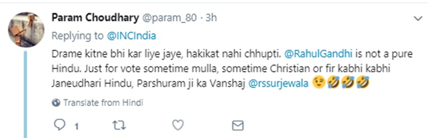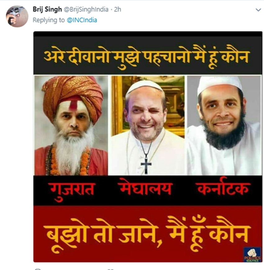 कांग्रेस अध्यक्ष राहुल गांधी बुधवार (21 मार्च) को एक मंदिर गए। पार्टी ने उनके मंदिर जाने के दौरान का वीडियो बनाया। बाद में सोशल मीडिया पर उसे पोस्ट किया। यह सोचकर कि लोगों पर उसका सकारात्मक असर होगा। लेकिन असल में इसका बिलकुल उल्टा हुआ। इंटरनेट यूजर्स ने इसे राहुल और कांग्रेस का पॉलिटिक स्टंट करार दिया। कहा कि हिंदू पांच सालों से धर्म और अपनों के प्रति सजग क्या हुए, राहुल जैसे ढोंगी मंदिर भटकने लगे। वह दिन दूर नहीं जब ऐसे ही झूठे धर्मनिरपेक्ष लोग राम मंदिर बनाने की वकालत करेंगे। किसी ने इसे उनकी ड्रामेबाजी और नौटंकी बताया तो कोई कहता दिखा कि कांग्रेस अध्यक्ष ने तीन महीनों में तीन बार धर्म परिवर्तन किया। आपको बता दें कि कांग्रेस मुखिया इस वक्त कर्नाटक में हैं। वह यहां अपने दो दिवसीय दौरे पर हैं। राहुल ‘जन आशीर्वाद’ नाम की यात्रा के तहत राज्य के विभिन्न इलाकों में घूम रहे हैं। चूंकि आने वाले दिनों में यहां विधानसभा चुनाव होने हैं। ऐसे में जानकार उनके इस दौरे को चुनाव के लिहाज से महत्वपूर्ण बता रहे हैं।