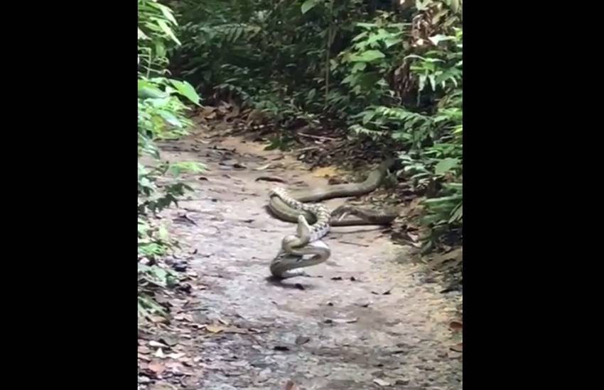 सिंगापुर में हुए दो सांपों की लड़ाई का वीडियो इन दिनों सोशल मीडिया पर काफी वायरल हो रही है। एक शख्स ने बड़े ही शानदार तरीके से कोबरा और अजगर की लड़ाई को अपने कैमरे में कैद कर लिया और उसे फेसबुक पेज पर पोस्ट कर दिया। वीडियो में काफी लंबा और मोटा कोबरा धीरे-धीरे अजगर की ओर बढ़ता दिखाई दे रहा है। वो उसे कमजोर शिकार समझकर अचानक से उसकी पूंछ पर हमला कर देता है। हालांकि, इस बीच अजगर को भी खतरे का अंदेशा रहता है। वो भी अपने बचाव में कोबरा पर हमला कर देता है।
