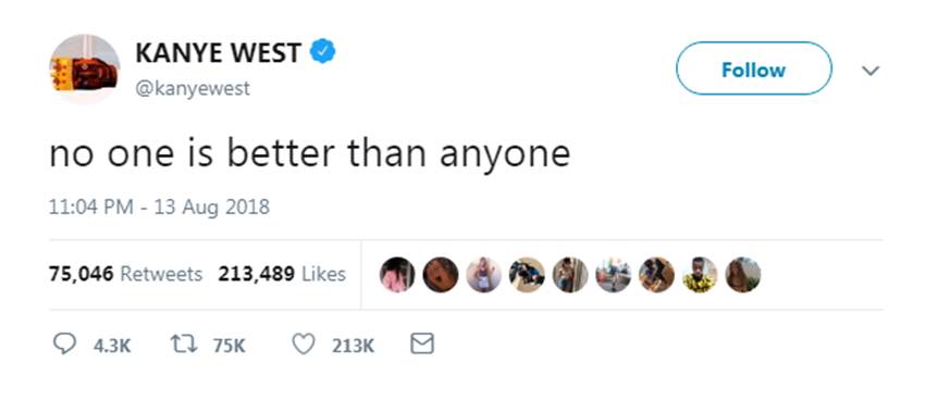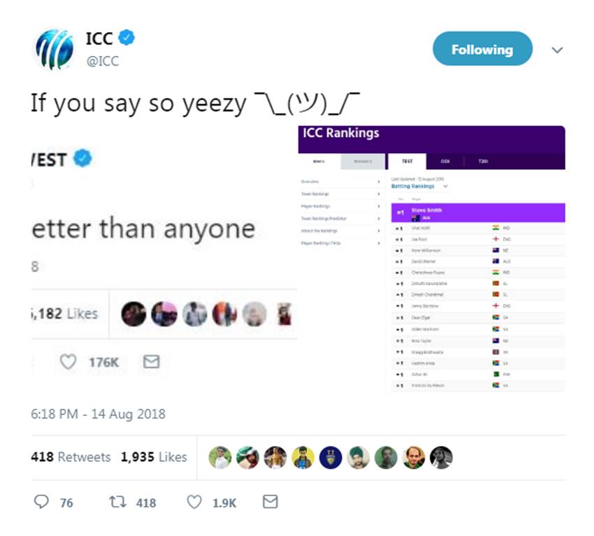 इंटरनेशनल क्रिकेट काउंसिल (आईसीसी) ने मंगलवार (14 अगस्त) को सभी टेस्ट बल्लेबाजों को अपनी रैकिंग में नंबर एक पर पहुंचा दिया। आईसीसी ने ऐसा मजाक में कुछ देर के लिए किया था, जिसके पीछे का कारण थे अमेरिका के पॉप गायक और रैपर कान्ये वेस्ट। उन्होंने कुछ ट्वीट्स में लिखा था, “कोई भी किसी से बेहतर नहीं है।”