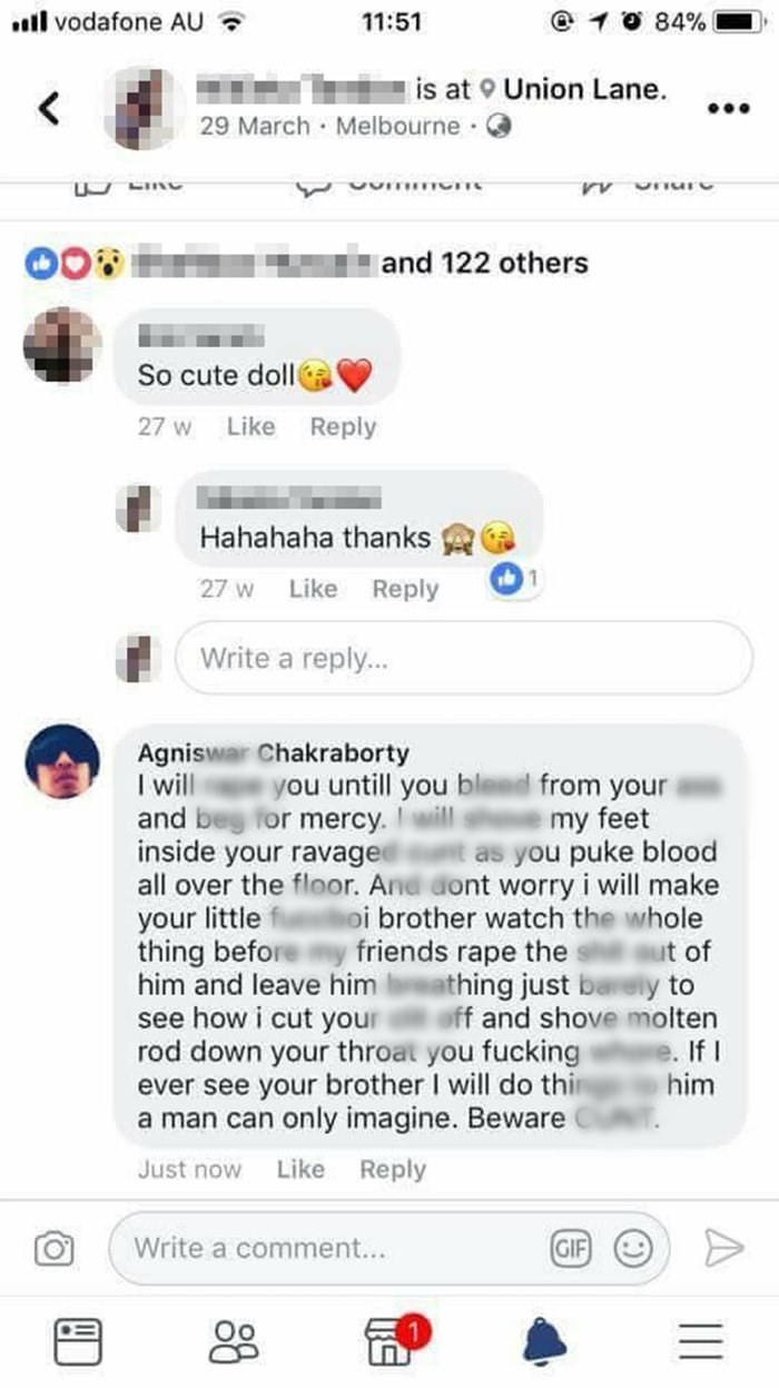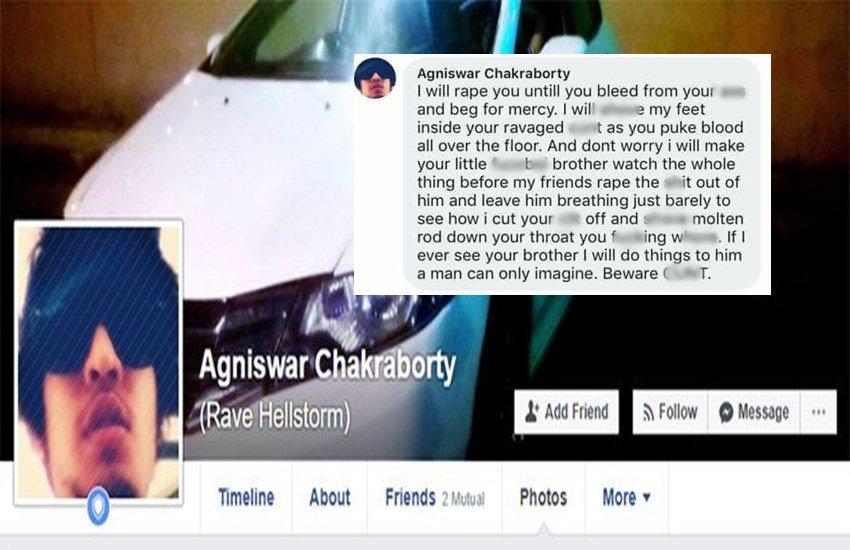 आए दिन सोशल मीडिया पर खुलेआम बलात्कार की धमकियों की खबरें आती रहती हैं। पिछले कुछ समय से इस तरह के मामले बढ़ गए हैं। अबी हाल ही में समाजवादी पार्टी की महिला प्रवक्ता को भी उनके ट्विटर हैंडल पर रेप करने की धमकी मिली थी। एक बार फिर से ऐसा ही एक मामला सामने आया है। ये मामला पश्चिम बंगाल की राजधानी कोलकाता का बताया जा रहा है। अंग्रेजी पोर्टल स्कूपवूप की खबर के मुताबिक अग्निश्वर चक्रवर्ती नाम का फेसबुक यूज़र एक लड़की की फोटो पर उसे बलात्कार करने की धमकी दे रहा है। दरअसल हुआ ये कि पीड़िता लड़की ने अपने फेसबुक अकाउंट से अपनी एक तस्वीर अपलोड की थी। लड़की की तस्वीर पर आरोपी अग्निश्वर ने कमेंट में एक स्माइली भेजा। लड़की अग्निश्वर को जानती नहीं थी इसलिए उसने उसका स्माइली डिलीट कर दिया।