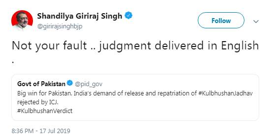 हालिया फैसले के कुछ ही देर बाद पाकिस्तानी सरकार के ट्विटर हैंडल से लिखा गया, “यह पाकिस्तान के लिए बड़ी जीत है। आईसीजे ने जाधव को रिहा करने और भारत भेजने की मांग खारिज कर दी।” सिंह ने इसी पर लिखा, “इसमें आपकी गलती नहीं है। फैसला ही अंग्रेजी में सुनाया गया।”