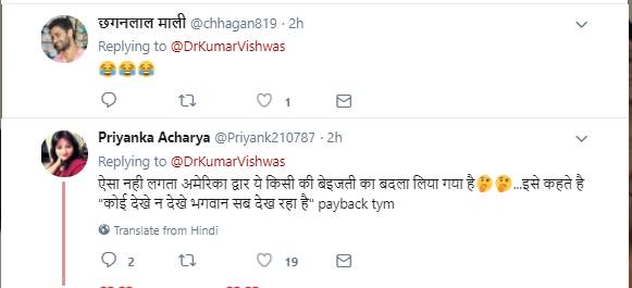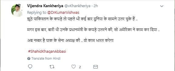 सोशल मीडिया यूजर्स विजेंद्र कांखेरिया ने लिखा-पाकिस्तान के कपड़े तो पहले भी कई बार दुनिया के सामने उतर चुके हैं। मगर इस बार बारी थी उनके प्रधानमंत्री के कपड़े उतरने की, जो अमेरिका ने कर दिया। प्रियंका आचार्य ने लिखा-ऐसा नही लगता अमेरिका द्वारा ये किसी की बेइज्जती की बदला लिया गया है, इसे कहते हैं-कोई देखे न देखे, भगवान सब देख रहा है।