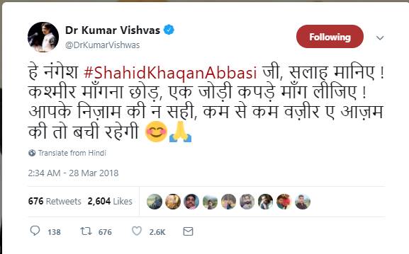 अमेरिका के एयरपोर्ट पर चेकिंग के दौरान पाकिस्तानी प्रधानमंत्री शाहिद खक्कान अब्बासी के कपड़े उतरवाने की घटना पर कवि डॉ. कुमार विश्वास ने मौज ली है। उन्होंने पाकिस्तान के प्रधानमंत्री को नंगेश करार दिया है। ट्वीट करते हुए लिखा,”हे नंगेश #ShahidKhaqanAbbasi जी, सलाह मानिए ! कश्मीर मांगना छोड़, एक जोड़ी कपड़े मांग लीजिए ! आपके निज़ाम की न सही, कम से कम वज़ीर ए आज़म की तो बची रहेगी।” कुमार विश्वास की इस चुटकी पर सोशल मीडिया यूजर्स ने भी मौज लेनी शुरू कर दी।