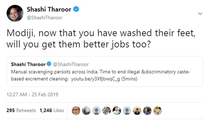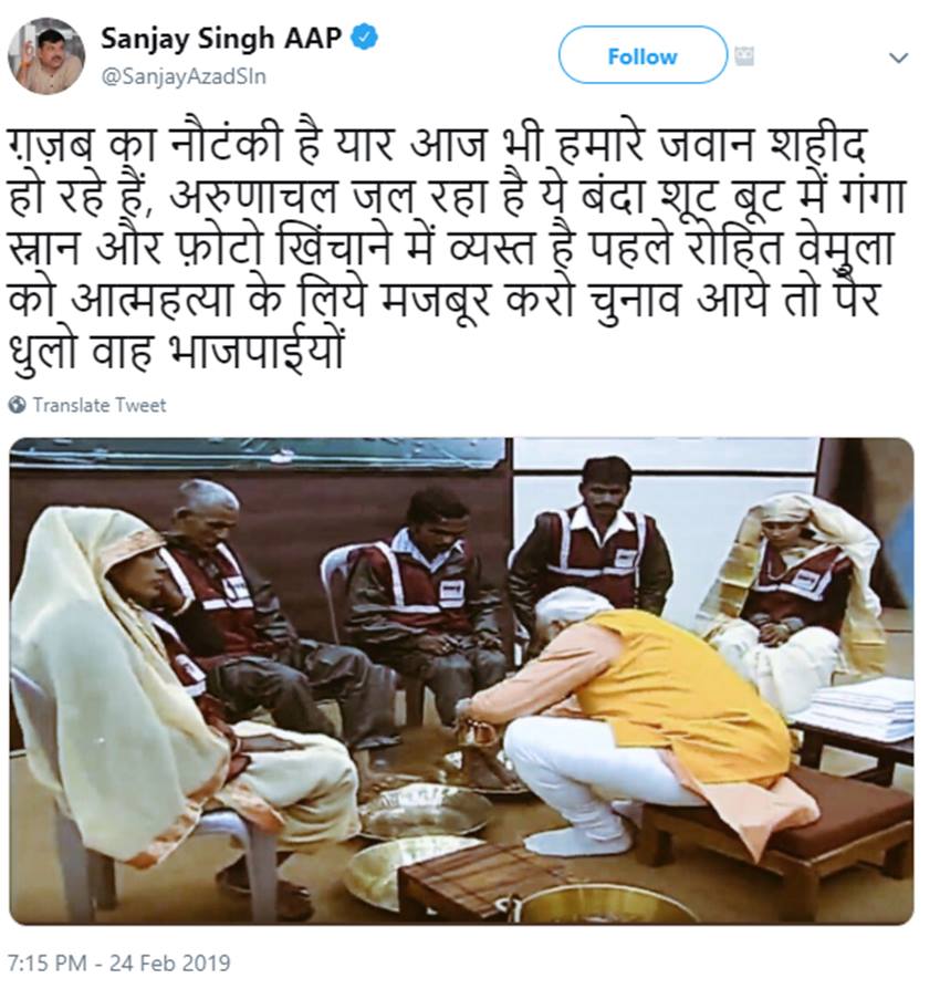कांग्रेस नेता शशि थरूर ने ट्वीट कर पूछा, “मोदीजी, अब जब आपने उनके (स्वच्छाग्रहियों) चरण धो चुके हैं, क्या आप उन्हें बेहतर नौकरियां भी दिलवाएंगे?” प्रधानमंत्री के गृह राज्य गुजरात से विधायक जिग्नेश मेवानी ने लिखा, “दलितों और पिछड़ों को सम्मान भरा रोजगार चाहिए, आपका बाह्मणवाद नहीं।” आम आदमी पार्टी के राज्यसभा सांसद संजय सिंह ने लिखा, “आज भी हमारे जवान शहीद हो रहे हैं, अरुणाचल जल रहा है ये बंदा शूट बूट में गंगा स्नान और फोटो खिंचाने में व्यस्त है। पहले रोहित वेमुला को आत्महत्या के लिये मजबूर करो, चुनाव आये तो पैर धुलो।”