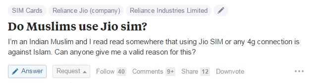 सोशल मीडिया प्लैटफॉर्म कोरा (quora) पर एक सवाल इन दिनों छाया हुआ है। उसमें कोई कथित भारतीय मुस्लिम लड़का रिलायंस जियो के बारे में एक सवाल पूछता है। जिसके लोग मजेदार जवाब दे रहे हैं। लड़के का सवाल था, ‘क्या मुसलमान जियो सिम का इस्तेमाल करते हैं?’ उसने आगे लिखा ‘मैं एक भारतीय मुस्लिम हूं, मैंने हर जगह सुना है कि रिलायंस जियो या फिर कोई भी 4जी कनेक्शन इस्तेमाल करना इस्लाम के खिलाफ है, क्या कोई इसके लिए मुझे सही तर्क दे सकता है?’