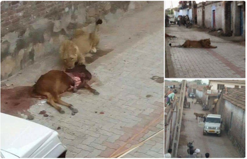 गुजरात के एक गांव में एक मादा शेर मोहल्ले की सड़कों पर घूमती हुई नजर आई है। घटना अमरेली के सासन गीर के वीरपुर गांव की है जहां पर यह मादा शेर गांव के एक मोहल्ले में घूम रही है। इसका वीडियो समाचार एजंसी एएनआई पर उपलब्ध है। वीडियो में मादा शेर मोहल्ले की सड़कों पर भागती हुए नजर आ रही है, जिससे खौफज़दा हुए गांव के लोग भी अपनी जान बचाने के लिए भागते हुए नजर आ रहे हैं। वीडियो काफी ऊंचाई से शूट किया गया है जिसमें मादा शेर की साफ तस्वीरें दिख रही हैं। वहीं ऐसी खबरें भी मिल रही हैं कि मादा शेर काफी समय से मोहल्ले में घूम रही थी। इसके अलावा शेरनी के एक मवेशी को मारकर, उसे मोहल्ले में ही बैठकर खाती हुई तस्वीरें भी मिली हैं। वहीं शेरनी के हमले से किसी इंसान के घायल होने या मौत होने की जानकारी अभी तक नहीं मिल पाई है।