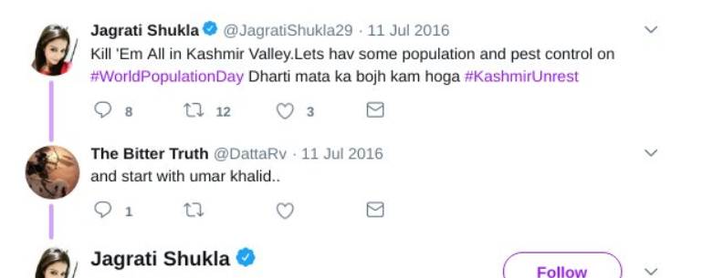 बता दें कि ये कोई पहला मौका नहीं है जब उनके अकाउंट से ऐसा ट्वीट हुआ हो। कश्मीर पर ही जागृति का एक और ट्वीट काफी वायरल हुआ था। उस ट्वीट में लिखा गया था कि ‘कश्मीरी घाटी के सभी लोगों को मार दिया जाए जिससे जनसंख्या में कुछ कमी आएगी और धरती माता का बोझ कम होगा।’