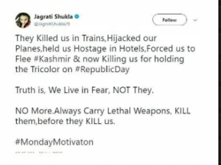 कासगंज हिंसा के दौरान भी जागृति के एक ट्वीट के चलते ट्विटर ने कार्रवाई की थी। तब जागृति शुक्ला ने ट्वीट कर लिखा था, ‘उन्होंने हमें ट्रेन में मारा, हमारे विमान लूटे, होटल में हमें बंधक बनाया, हमें कश्मीर से भागने पर मजबूर किया और अब गणतंत्र दिवस पर तिरंगा फहराने के लिए मार रहे हैं। सच ये है कि हम डर में रहते हैं, वो नहीं, अब और नहीं। हमेशा घातक हथियार साथ में रखिए। उन्हें मार दीजिए, इससे पहले वो हमें मार दें।’