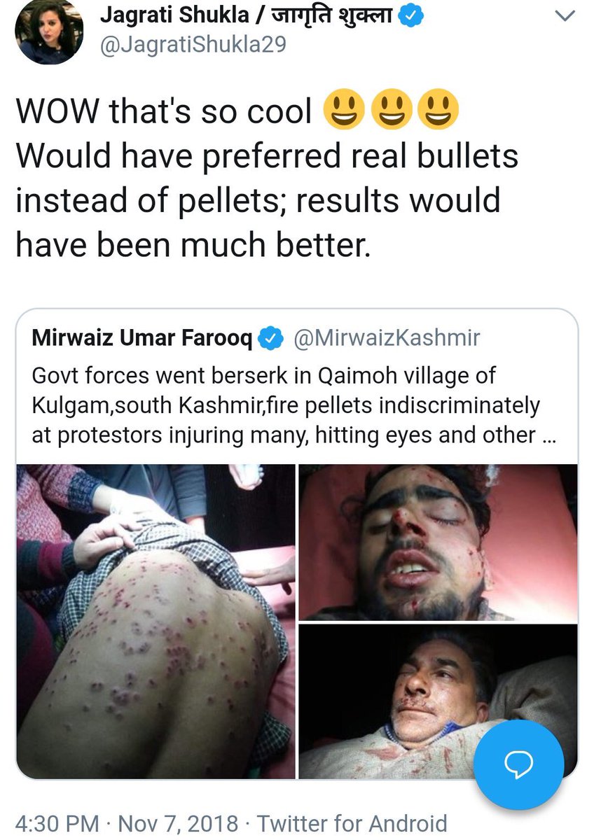 लोकसभा टीवी में असिस्टेंट प्रोड्यूसर के तौर पर काम कर रहीं जागृति शुक्ला का ट्विटर अकाउंट सस्पेंड हो गया है। माना जा रहा है कि जागृति के आपत्तिजनक ट्वीट के कारण ट्विटर इंडिया ने उनका अकाउंट सस्पेंड कर दिया है। हालांकि अकाउंट सस्पेंड होने के बाद भी उनके विवादित ट्वीट्स के स्क्रीनशॉट वायरल हो रहे हैं। सोशल मीडिया यूजर्स द्वारा कयास लगाए जा रहे हैं कि कश्मीरियों पर उनके विवादित ट्वीट के कारण ही उनका अकाउंट सस्पेंड हुआ है। जो स्क्रीनशॉट वायरल हो रहे हैं उसमें दिखा रहा है कि 7 नवंबर को जागृति ने अपने ऑफिशियल ट्विटर हैंडल से पेलेट गन से पीड़ितों की पुरानी तस्वीर रीट्वीट की। रीट्वीट करते हुए लिखा कि, ‘इनपर तो पेलेट गन की जगह असली गोली का इस्तेमाल करना चाहिए था। नतीजा और भी बेहतर होता।’ @MirwaizKashmir ने पेलेट गन पीड़ितों की तस्वीर पोस्ट करते हुए सुरक्षा बलों पर सवाल उठाया था। इसी को रीट्वीट करते हुए जागृति ने इन पर असली गोलियां दागने की वकालत करते हुए टिप्पणी की।