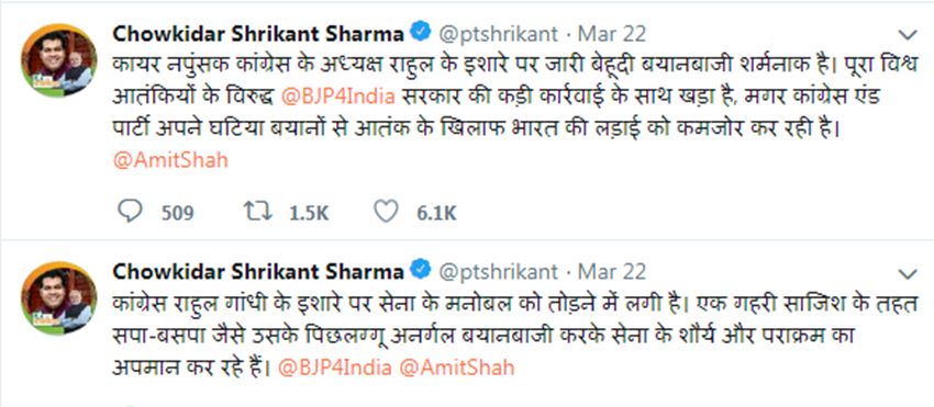 Lok Sabha Election 2019: उत्तर प्रदेश सरकार में उर्जा मंत्री श्रीकांत शर्मा ने कांग्रेस अध्यक्ष राहुल गांधी को लेकर एक ऐसी टिप्पणी की जिसके बाद वे सोशल मीडिया यूजर्स के निशाने पर आ गए। भाजपाई मंत्री ने राहुल गांधी को कायर व नपुंसक कह डाला। इसके बाद यूजर्स ने भाषा और तमीज की दुहाई देते हुए उनकी खिंचाई कर दी। श्रीकांत शर्मा ने कहा, “कायर नपुंसक कांग्रेस के अध्यक्ष राहुल के इशारे पर जारी बेहूदी बयानबाजी शर्मनाक है। पूरा विश्व आतंकियों के विरुद्ध भाजपा सरकार की कड़ी कार्रवाई के साथ खड़ा है, मगर कांग्रेस एंड पार्टी अपने घटिया बयानों से आतंक के खिलाफ भारत की लड़ाई को कमजोर कर रही है। कांग्रेस राहुल गांधी के इशारे पर सेना के मनोबल को तोड़ने में लगी है। एक गहरी साजिश के तहत सपा-बसपा जैसे उसके पिछलग्गू अनर्गल बयानबाजी करके सेना के शौर्य और पराक्रम का अपमान कर रहे हैं।”