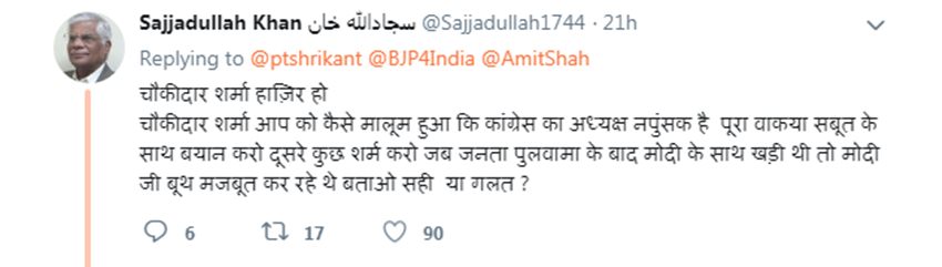 भाजपाई मंत्री इस बयान पर एक यूजर ने लिखा, “चौकीदार शर्मा हाजिर हो। चौकीदार शर्मा आप को कैसे मालूम हुआ कि कांग्रेस का अध्यक्ष नपुंसक है। पूरा वाकया सबूत के साथ बयान करो दूसरे कुछ शर्म करो। जब जनता पुलवामा के बाद मोदी के साथ खड़ी थी तो मोदी जी बूथ मजबूत कर रहे थे। बताओ सही या गलत?”